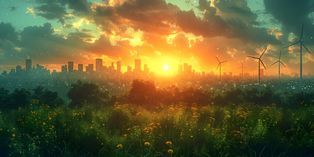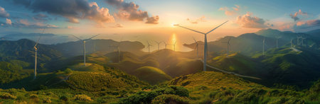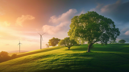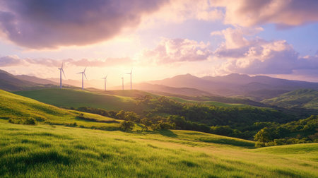 A picturesque landscape featuring wind turbines at sunset amidst rolling hills. The scene captures the essence of renewable energy surrounded by vibrant nature.