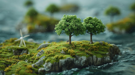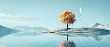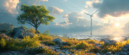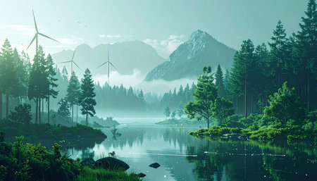 A breathtaking landscape showcasing a serene ecosystem with wind turbines, lush greenery, and tranquil waters, promoting sustainability and nature's beauty.