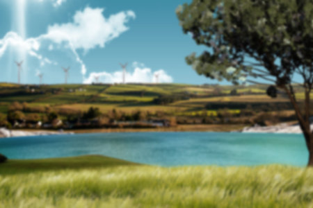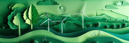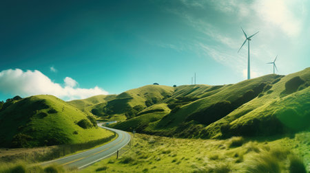 Scenic landscape featuring lush green hills, wind turbines, and a bright blue sky. A perfect illustration of renewable energy harmonizing with nature.