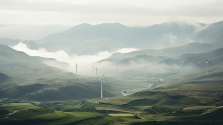 A scenic view showcases wind turbines amidst rolling green hills, combining technology and nature. The atmosphere is serene, evoking a sense of harmony and sustainability in the environment.