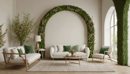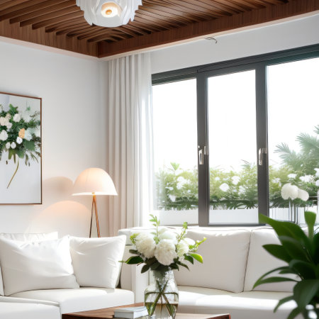 Experience the perfect blend of comfort and style in this cozy living room featuring modern furniture, abundant natural light, and lush indoor plants.