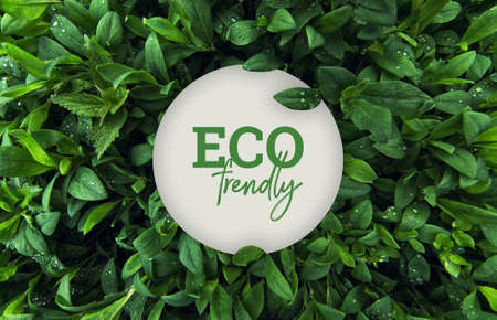 Eco concept with green leaves, water drops and blue word ECO