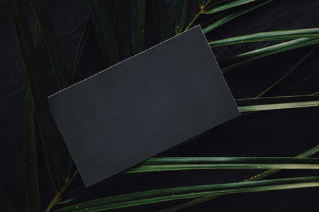 Black business card flatlay on dark stone background and green exotic leaf, luxury branding flat lay and brand identity design for mockup