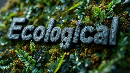 A 3D text reading 'Ecological' is embedded within vibrant green foliage, symbolizing sustainability and environmental consciousness through nature-inspired design elements.