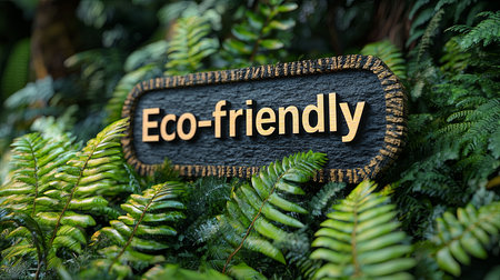 A wooden eco-friendly sign nestled amidst vibrant green leaves, symbolizing sustainability and nature conservation. Perfect for themes of environmental awareness and green living.