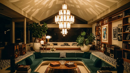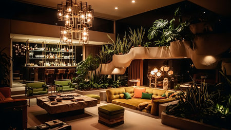 A stylish living room featuring modern furniture, lush plants, and a well-stocked bar area, with a vintage record player and decorative accents