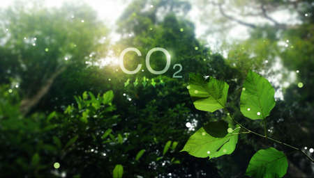 CO2 reducing icon and rotating blurred green forest. Concept of CO2 reduction for the environment, global warming, sustainable development and the green business of renewable energy.