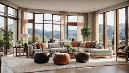 A stylish living room with large windows showcasing a mountain view, featuring modern furniture, warm autumn colors, and decorative plants