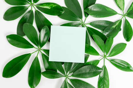 Background from tropical green leaf on white paper. Word eco. Copy space. Top view