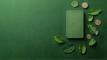 A vibrant green wallet, intricately designed, placed on a green background with leaves and coins around. The scene evokes a sense of sustainability and eco-consciousness.