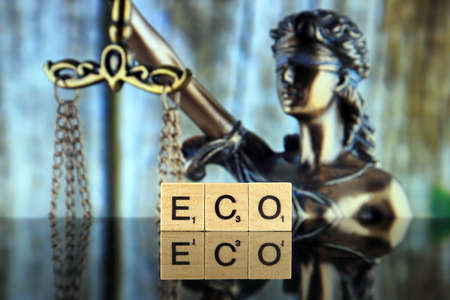 WROCLAW, POLAND - FEBRUARY 28, 2020: The word ECO made of scrabble letters, and symbol of law and justice in the background. Ecology law concept.