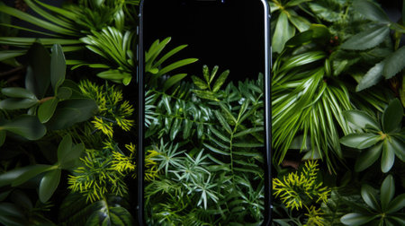 A cell phone sitting on top of a lush green plant. Generative AI image.
