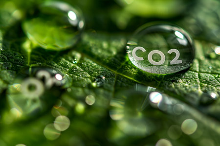 A digital illustration depicts a spherical landmass covered in green foliage and trees, with the word CO2 prominently displayed. The composition features a natural aesthetic with soft lighting and a blurred background, set within a natural environment. Conceptual elements and icons suggest environmental themes, ideal for various commercial uses.