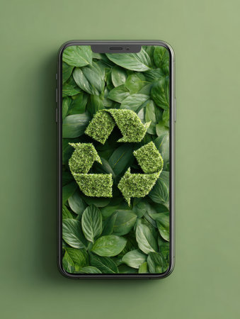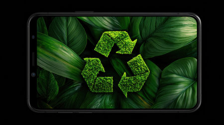 A smartphone shows a vibrant green recycling symbol formed by leaves, highlighting the importance of sustainability in technology.