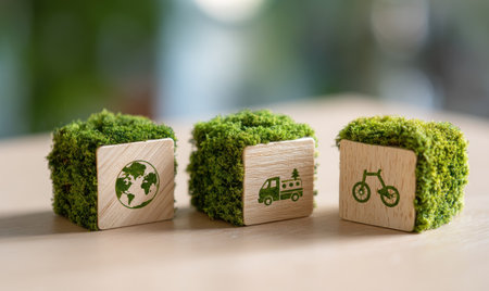 This image showcases a symbolic representation of eco-friendly logistics. It features wooden blocks adorned with transportation and environmental icons. The composition, set against a blurred background, uses natural colors and textures, possibly suggesting themes such as sustainability and global commerce. The image could be used for various commercial or editorial applications.