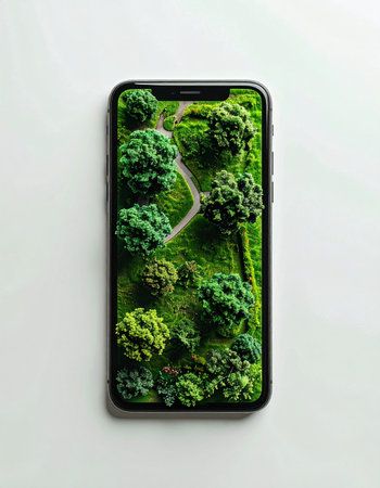 A smartphone on a clean white background displays a vibrant, aerial view of a dense green forest.