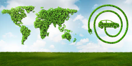 A 3D tree or forest shape of the world map on a white background. Earth Day or Environment Day Concept. Green earth with an electric car. Paris Agreement Concept..