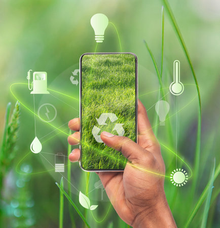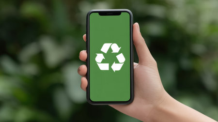 A hand holds a smartphone displaying a prominent green recycle symbol against a blurred natural background, highlighting the importance of eco-friendly practices in modern life.