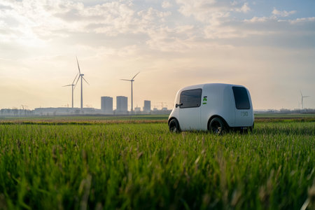 New energy vehicles on grassland with urban skyline and wind turbines in the background