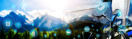 EV charging station for electric car in concept of alternative green energy produced from sustainable resources to supply to charger station in order to reduce CO2 emission .