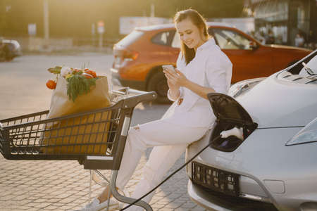Woman charging electric vehicle, taking a selfie with smartphone, modern technology and sustainable transport in urban environment