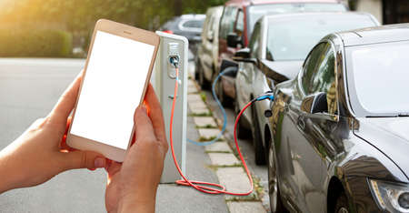 Closeup progressive businessman look at EV cars battery status application on smart phone screen at public parking charging station with power cable plug and renewable energy-powered electric vehicle