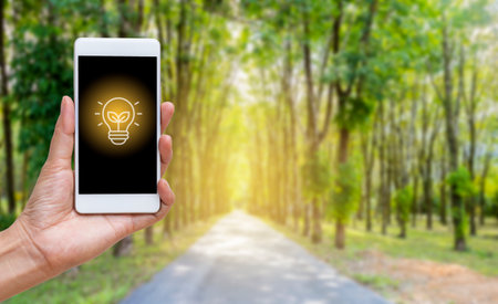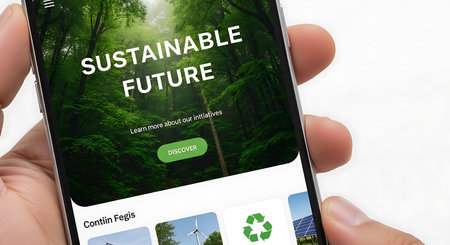 A smartphone displays a bright green leaf background, symbolizing nature and freshness. The design highlights the connection between technology and the environment, promoting eco-friendliness.