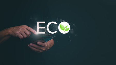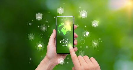 Eco-friendly mobile app with green leaf graphic surrounded by environmental icons promoting sustainability and green living. concept of sustainable technology, eco-conscious design.