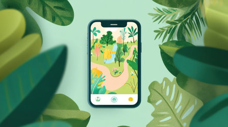 A vibrant travel app showcases a detailed nature guide on a smartphone, surrounded by lush greenery. Users can explore paths and discover nature's beauty through engaging features.