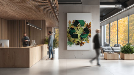 Green, sustainable and environmental office space with daily employee rush. Modern and nature friendly startup business with ESG standards and care for worker wellness and healthy environment