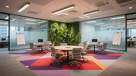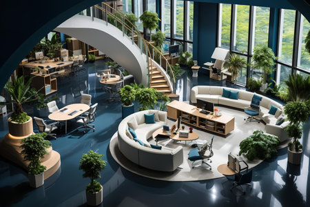 A modern office space filled with natural light and lush greenery creates a calming and productive work environment. This layout inspires creativity and collaboration.