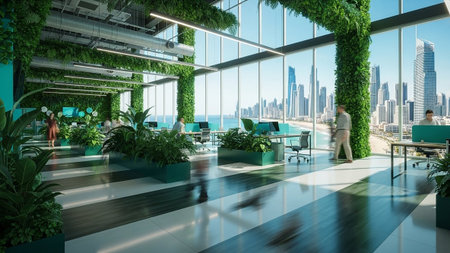 A contemporary office space bathed in natural light, featuring an abundance of indoor plants and vertical gardens. Large windows offer a panoramic view of a bustling city skyline and the ocean. The interior emphasizes sustainability and biophilic principles, creating a productive and calming work environment. Sleek furniture and modern technology are integrated seamlessly with the natural