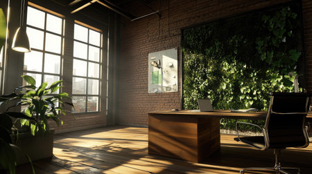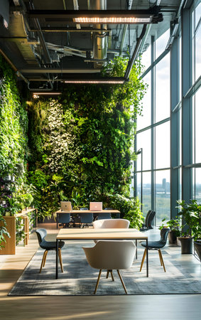 Title: Eco-Friendly Office Space with Vertical Green Wall and Modern Workspace