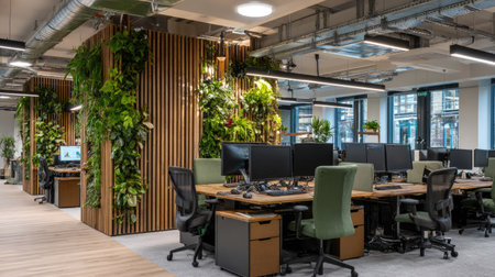 A modern office interior featuring abundant greenery and natural light. The workspace promotes a healthy and productive atmosphere, blending nature with technology.