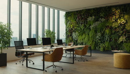 Modern office with lush green wall features and large windows, promoting productivity and serenity in the workplace.