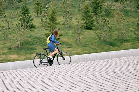 A young girl in zhdinsovom sarafan on a bicycle, climbs uphill. Bike tours in the city