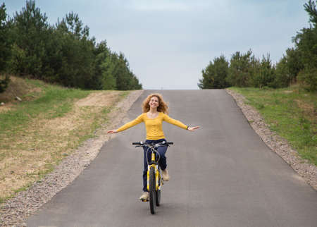 cute happy teenage girl with outstretched arms, not holding the steering wheel, is cycling down the road. harmony, freedom, feelings of joy, energy of nature, relaxation, active healthy lifestyle