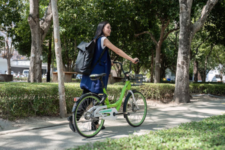 Asian businesswoman rides a bicycle to work in the office to reduce air pollution and protect the environment.