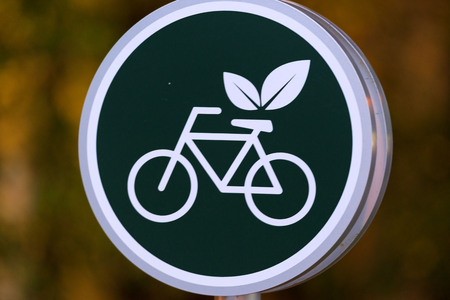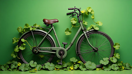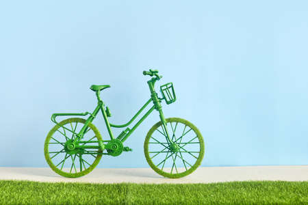 World bicycle day. Bicycle and tracks made from fresh green leaves on blue background. Sustainable and healthy concept