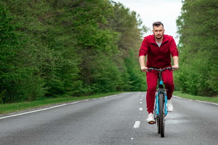 A man in a tracksuit on a bicycle rides on a road in the forest. The concept of a healthy lifestyle, cardio training. Copyspace