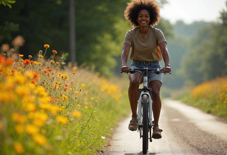 An attractive young tourist rides a bicycle on a road near the forest, stretching her legs and having fun and excited expressions, in the open air.