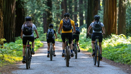 Young guys ride bicycles along a bike path strewn with autumn foliage