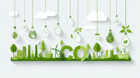 Green city landscape with factories, buildings, wind turbines and trees, hanging lightbulbs hold earth, leaves and seedlings to symbolize clean energy and environmental sustainability