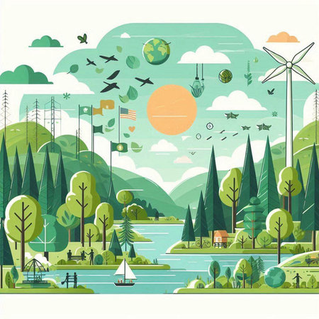 A visual celebration of sustainability efforts, emphasizing net-zero strategies, carbon-negative initiatives, and biodiversity conservation. This image reflects harmony within natures ecosystems