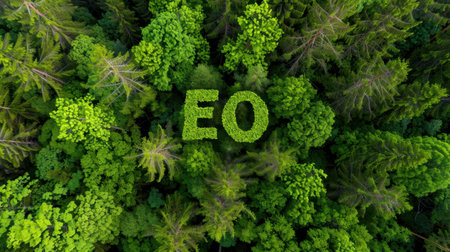 A stunning aerial view of a lush green forest showcasing the initials EO artfully crafted from leafy foliage, surrounded by rich greenery and towering trees.
