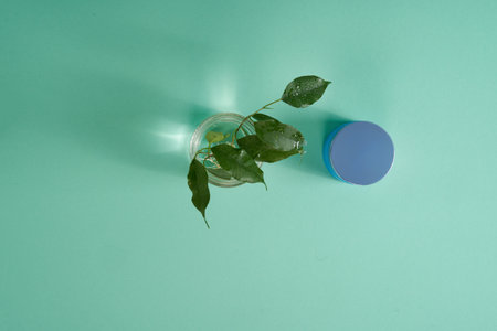 branch of pistachio tree with green leaves in a plastic bottle on a light blue background copy space
