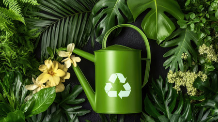 Green watering can with a recycling symbol placed among blooming flowers and lush plants in a vibrant garden.