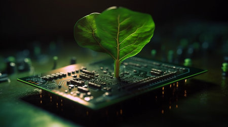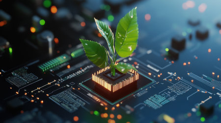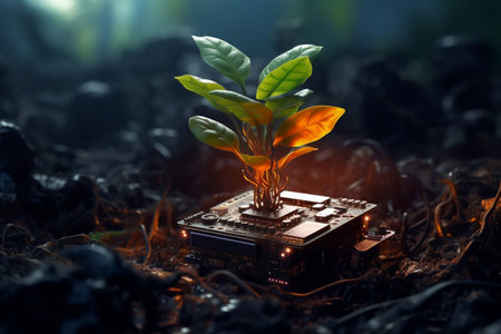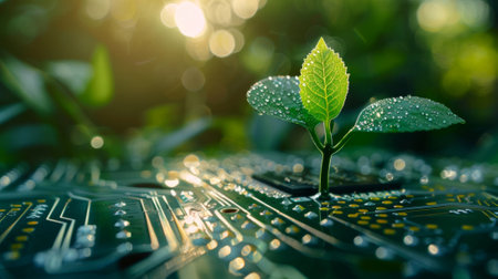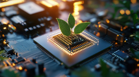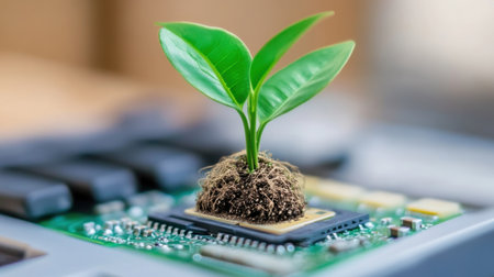 A plant sprouting from a computer chip symbolizes renewal, merging technology with nature in an eco friendly concept of growth and new beginnings.