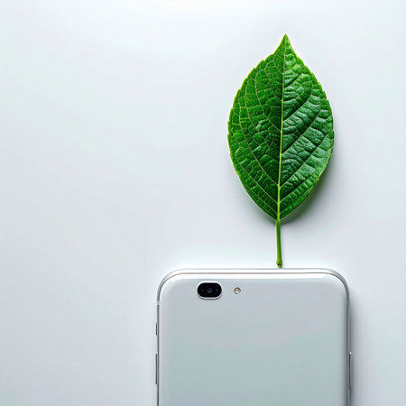 A single vibrant green leaf emerges from a modern smartphone, symbolizing the integration of nature with technology.