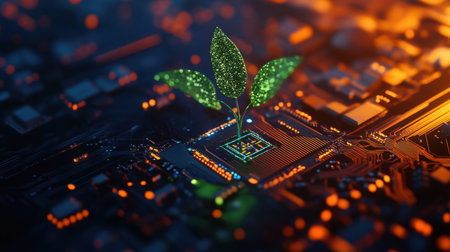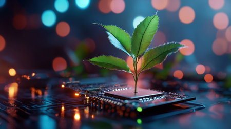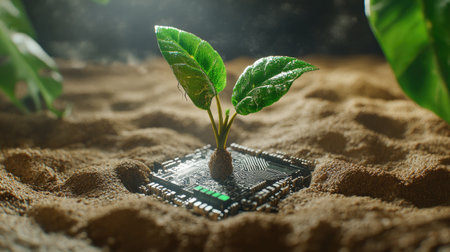 A striking image of a small plant sprouting from a microchip, symbolizing the intersection of technology and nature. The scene highlights innovation and growth.